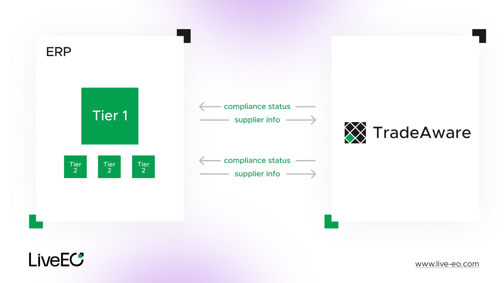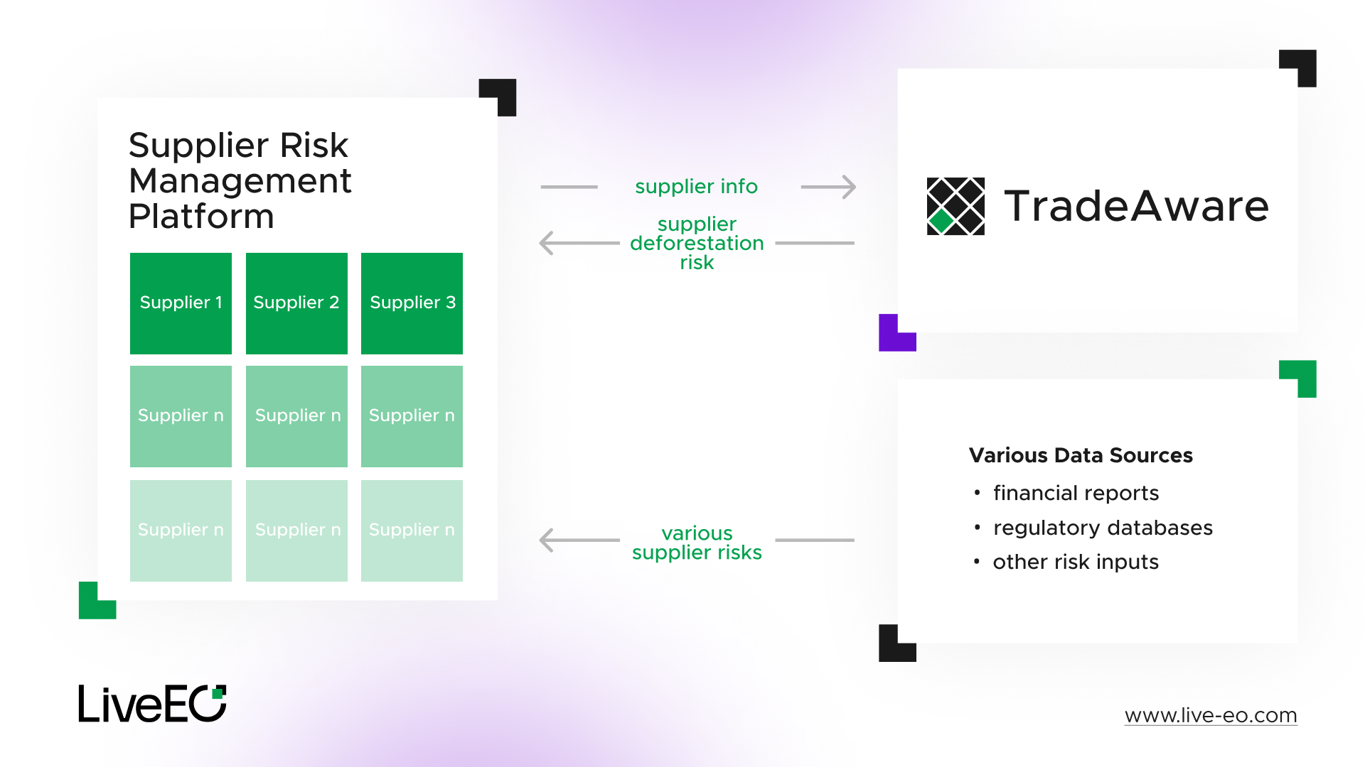 The API can ingest data from suppliers of different Tiers. TradeAware assesses the deforestation-free status for the suppliers and sends it back into the ERP system, enabling data-driven decision making and, if necessary, adjustments to the supply chain.