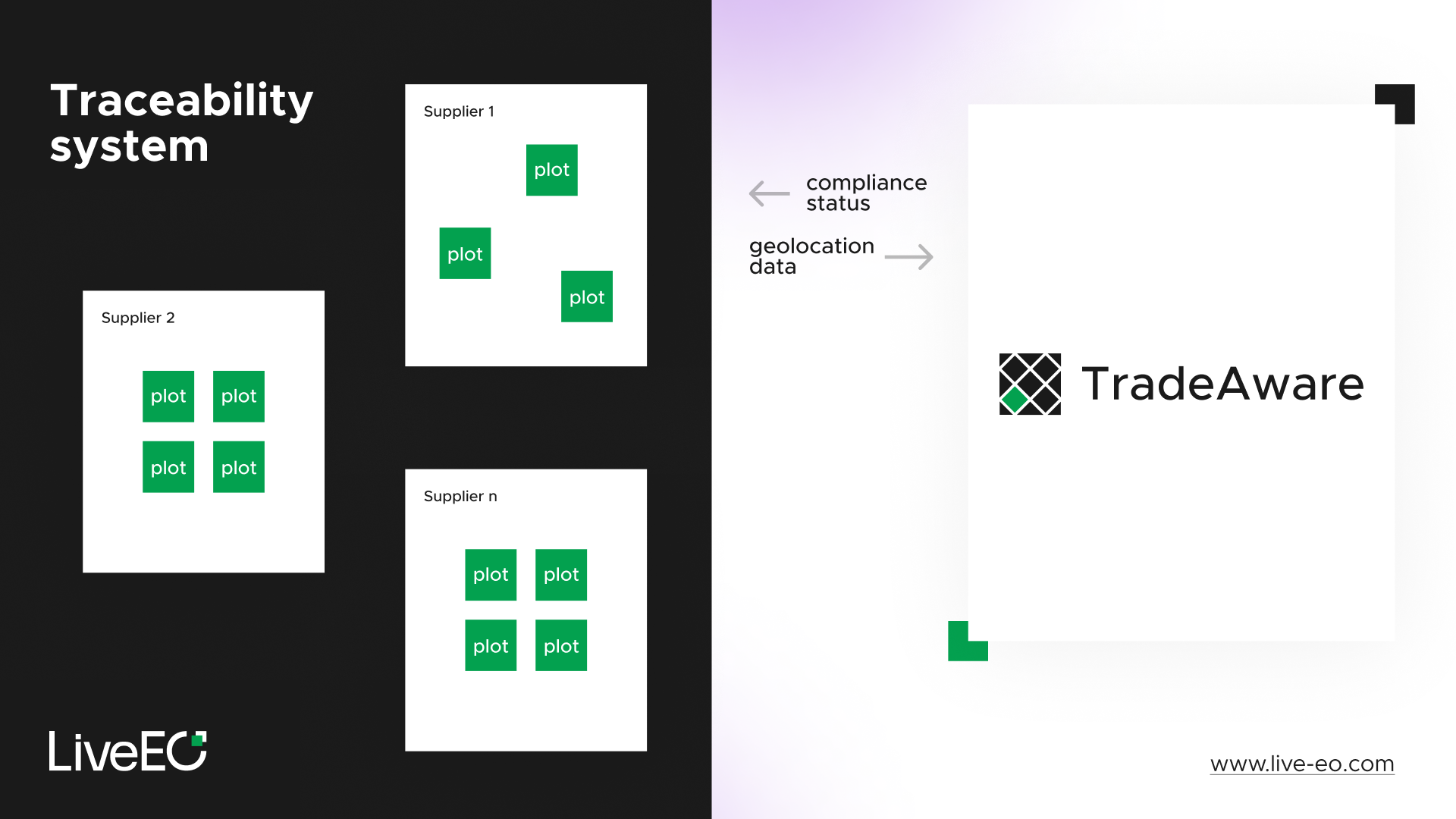 The geolocation data from the traceability platform can be ingested via API by TradeAware. TradeAware assesses the deforestation free-status for each of the plots and can return ad EUDR compliance status back to the traceability system.
