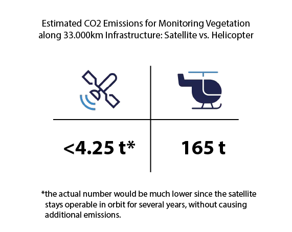 Let’s turn to a concrete example that we deal with at LiveEO: Vegetation Monitoring. An alternative to satellite inspection of vegetation along power lines is helicopter inspection. We look at the use case of vegetation monitoring of the German Railway network, which is the largest in Europe. How do satellites hold up against helicopters in terms of GHG emissions? Let’s look at the data.
