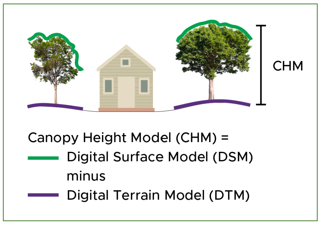 LiveEO achieves this by creating a Canopy Height Model (CHM) using a Digital Surface Model (DSM), which encodes the heights of the earth’s surface and all objects on it, and a Digital Terrain Model (DTM), which encodes the height of the ground.