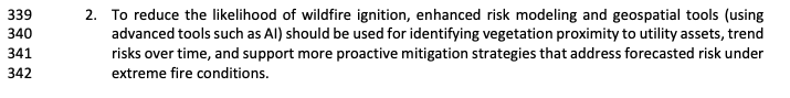The report's endorsement of AI-assisted geospatial tools for vegetation proximity modeling, trend analysis, and proactive risk identification aligns directly with this capability.