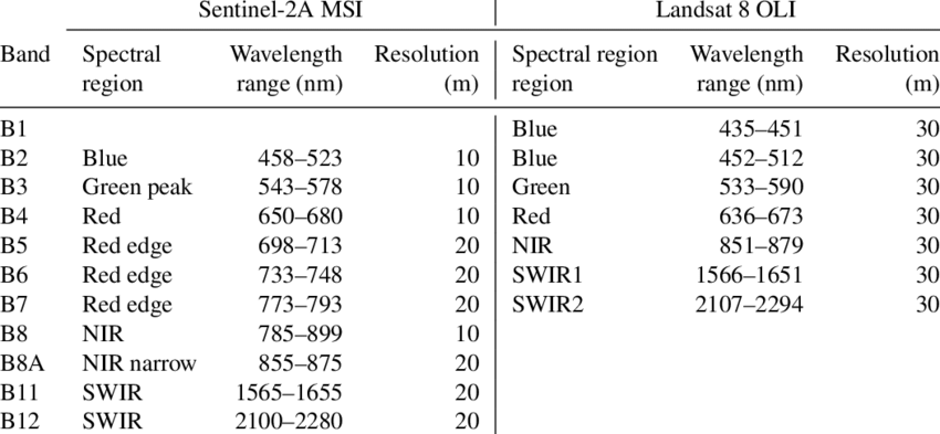 Los satélites Sentinel-2 (tanto A como B) contribuyeron al Programa Copernicus mediante la inclusión de instrumentos multiespectrales. Al igual que las campañas de Landsat, el objetivo principal del satélite Sentinel-2 es proporcionar datos satelitales para el monitoreo de la cobertura y el uso de la tierra, el monitoreo de desastres y el monitoreo del cambio climático. A diferencia del satélite Landsat 8, el satélite Sentinel-2A tiene 13 bandas, una resolución espacial mayor (10 m), bandas de borde rojo y una resolución temporal de 5 días. Aunque el Landsat 8 tiene solo 11 bandas, una resolución temporal de 16 días y una resolución espacial comparativamente baja (30 m); aunque sí contiene bandas térmicas. La mayor resolución espacial y temporal de Sentinel-2 tiende a convertirlo en una mejor base para la clasificación de la vegetación.