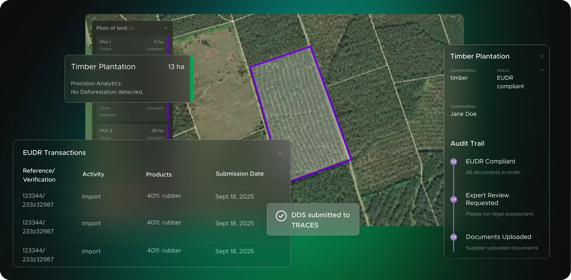 Explore how TradeAware brings EUDR compliance into a single, seamless workflow by combining precision deforestation analytics, expert-backed legality checks, and automated integrations to help you move faster, reduce risk, and stay audit-ready at scale.