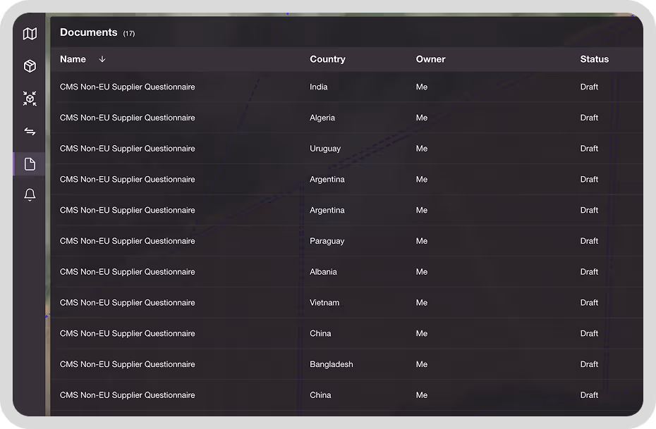 Collect land titles, production licenses, and other key documents from suppliers directly in TradeAware. With a simple, one-click trigger, you can send files for legal review, all within a centralized, secure workflow that reduces manual coordination and speeds up compliance.