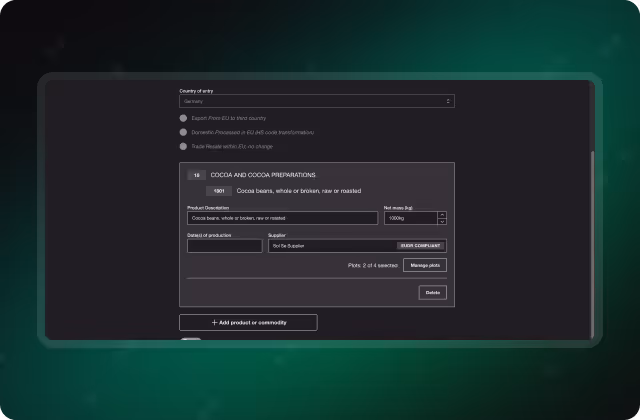 With plot-level assessments that require minimal verification, you can reduce internal workload, lower compliance costs, and accelerate your due diligence timelines, even across thousands of suppliers.