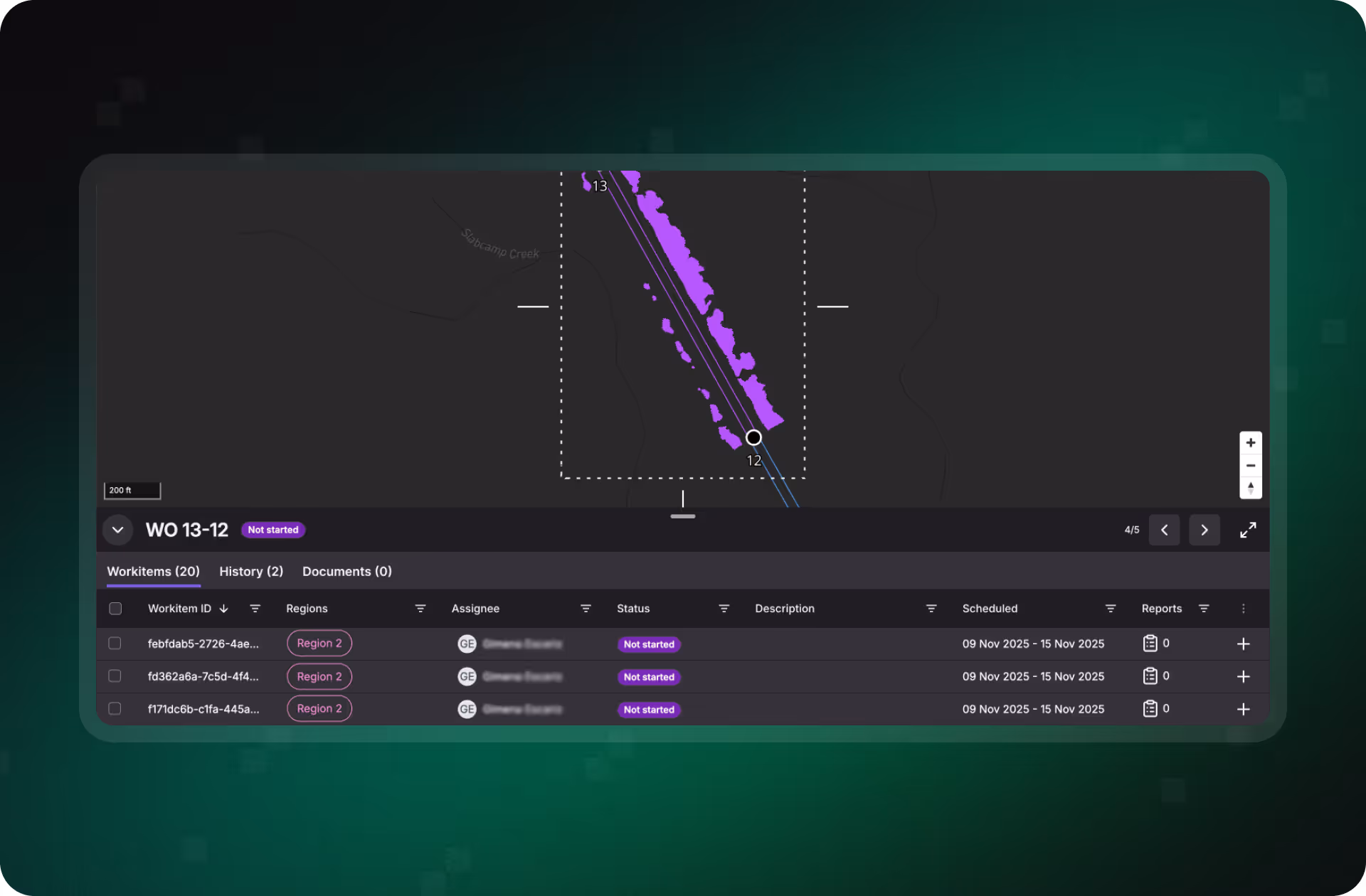 Each verified vegetation risk is converted into a discrete work item, tied to a specific span or asset. These work items are packaged into route-based orders that crews can access via web or mobile, complete with map context and span-level details.