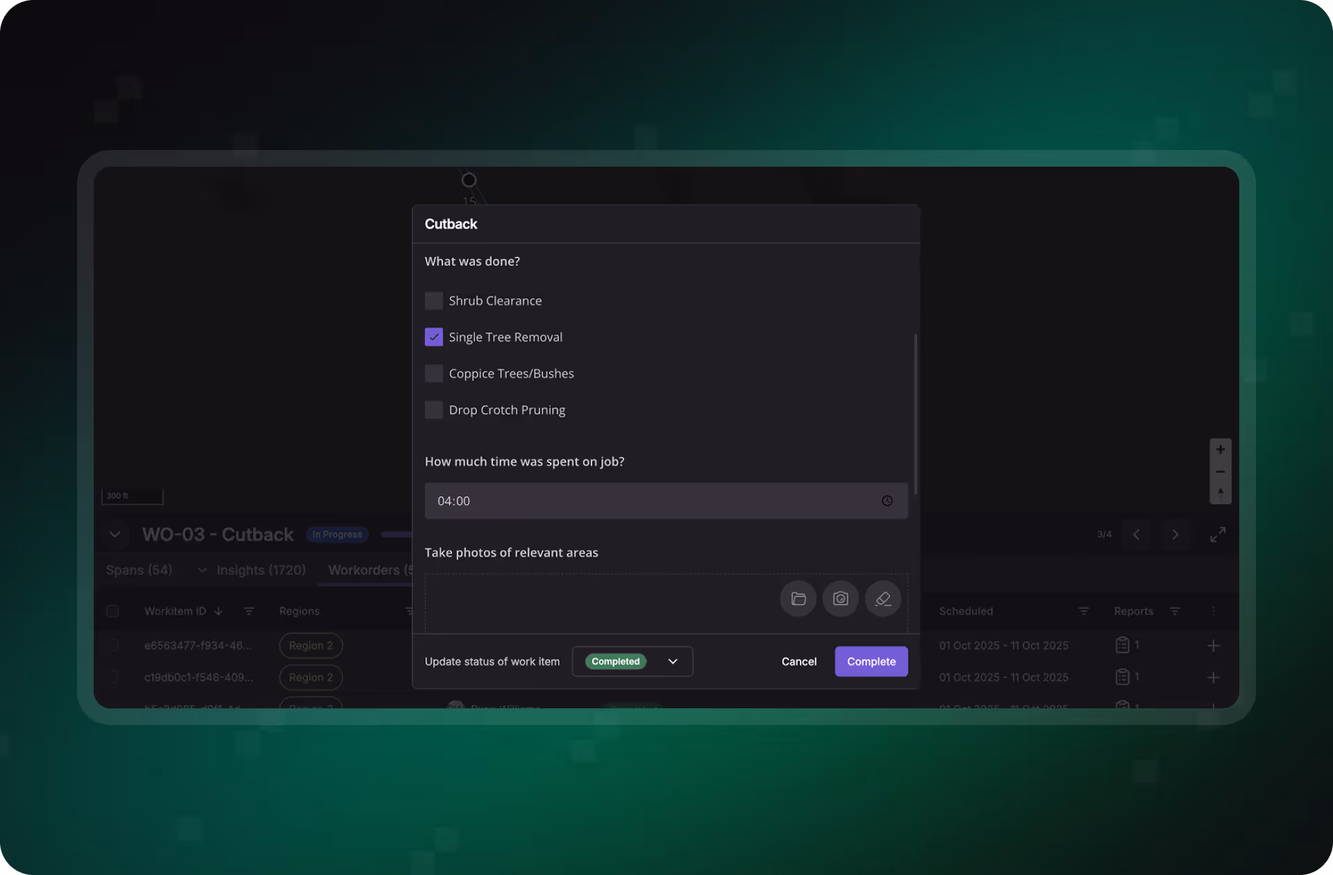 Treeline transforms vegetation work management by turning every risk insight into a traceable, map-based work order. Assign tasks, track progress, and verify completion with timestamped updates and GPS-tagged photos, all in a unified workflow that keeps field crews and planning teams in sync.