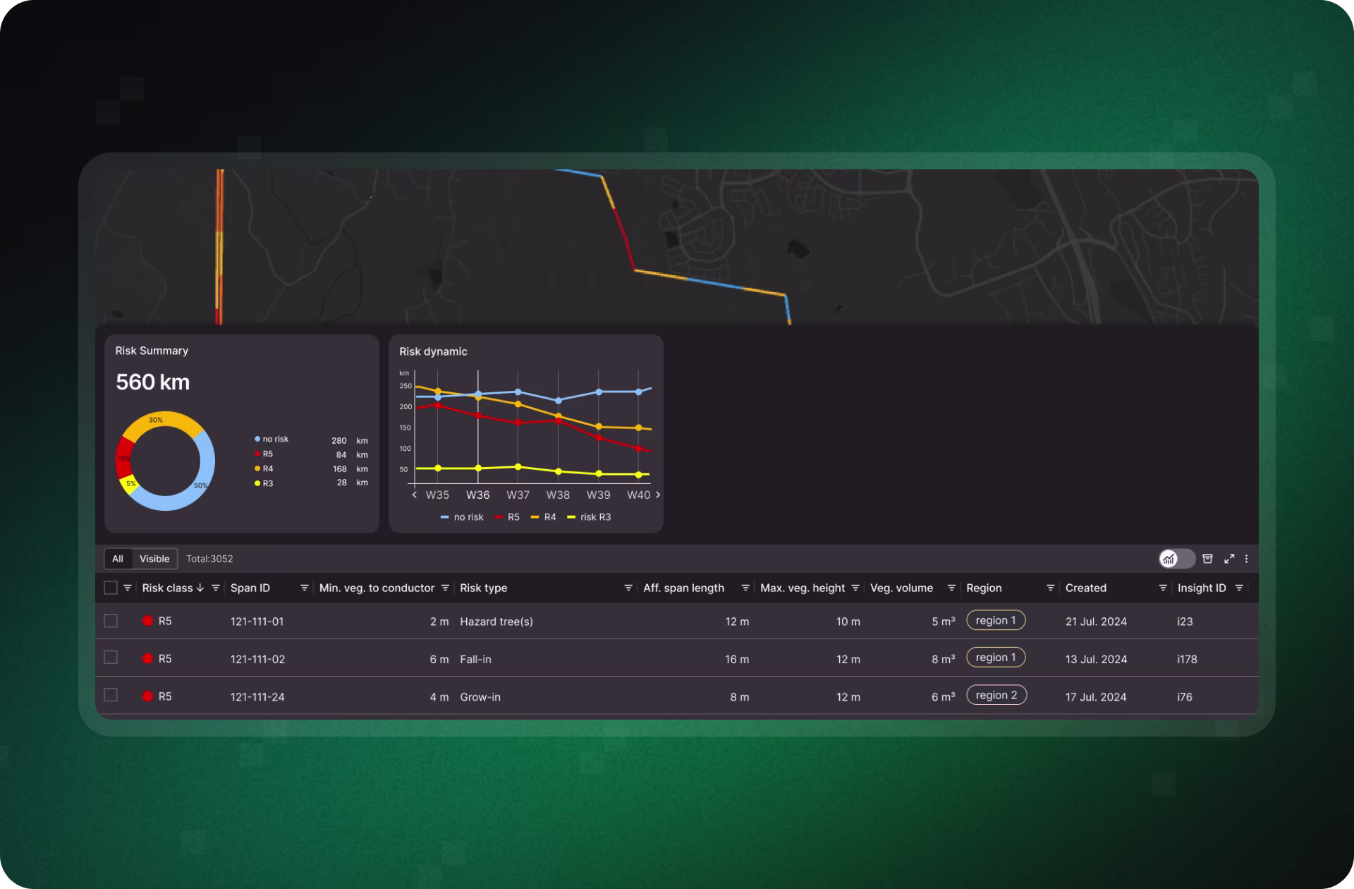 Every span is scored using a multi-factor risk model that weighs vegetation type, growth rate, proximity, and grid criticality. Color-coded dashboards and exportable work items highlight the spans most likely to cause outages, so resources go where they’ll have the greatest reliability impact.