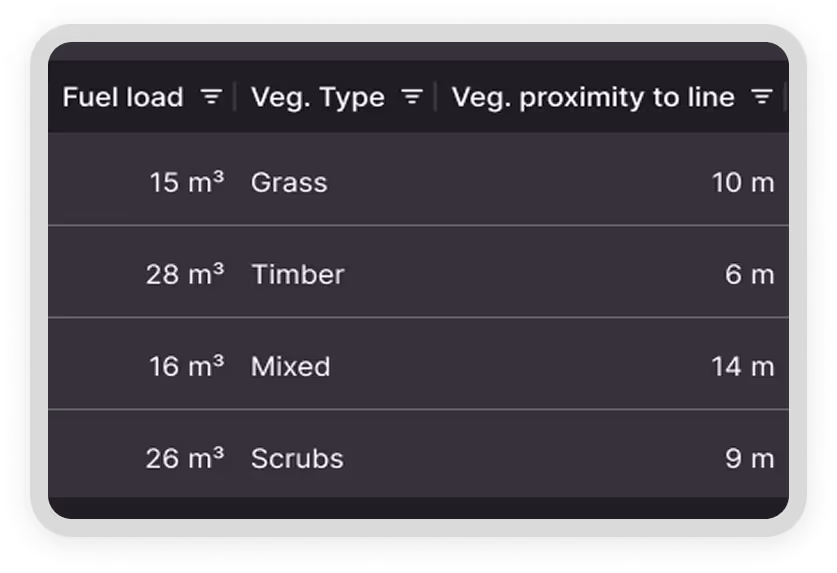 Treeline continuously scans clearance zones and surrounding corridors to detect flammable vegetation, fall-in risks, hazard trees, and stressed canopies. By combining encroachment detection, vitality insights, and fuel load mapping, utilities gain near-LiDAR precision visibility into the conditions most likely to spark wildfires.
