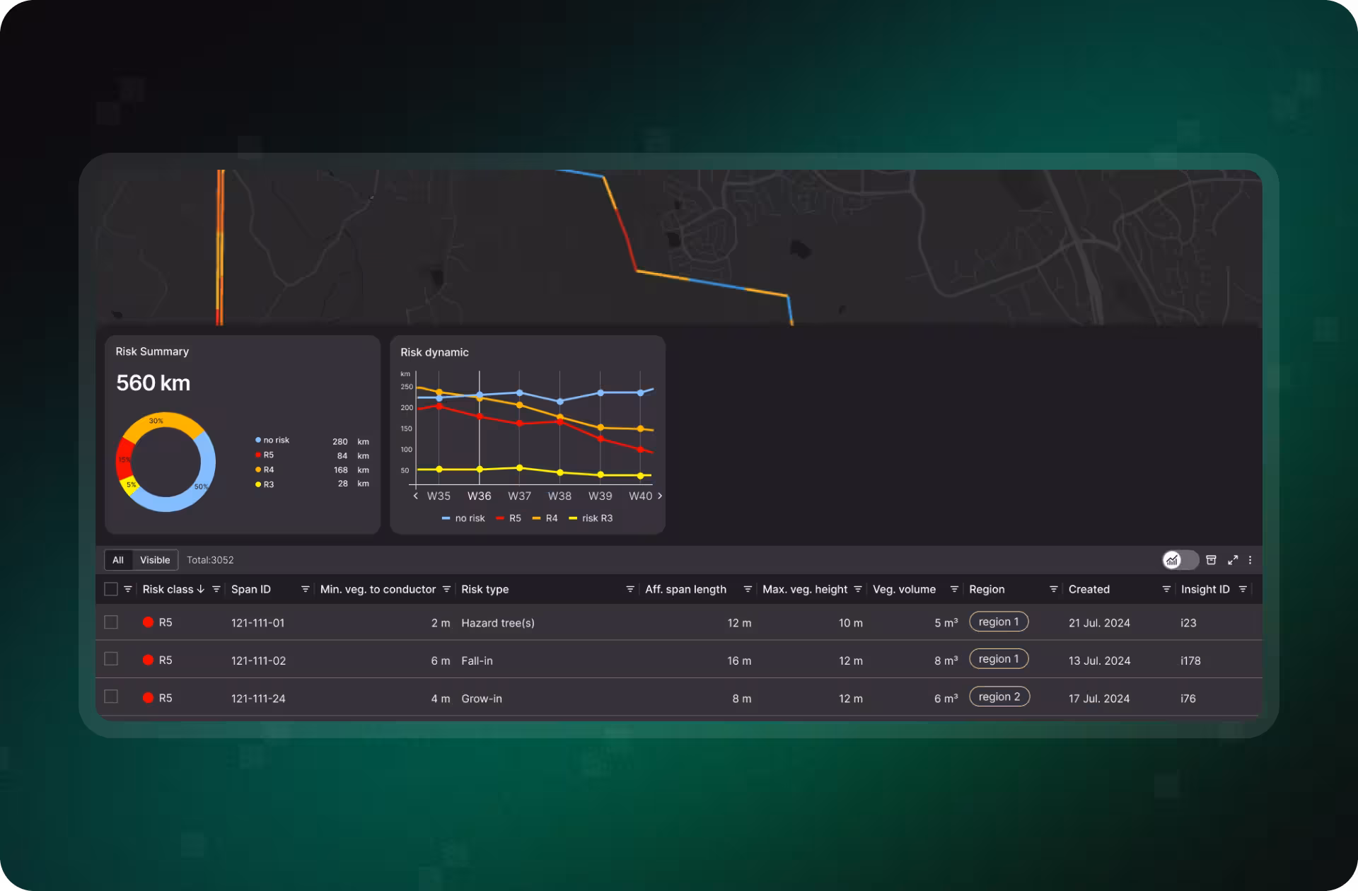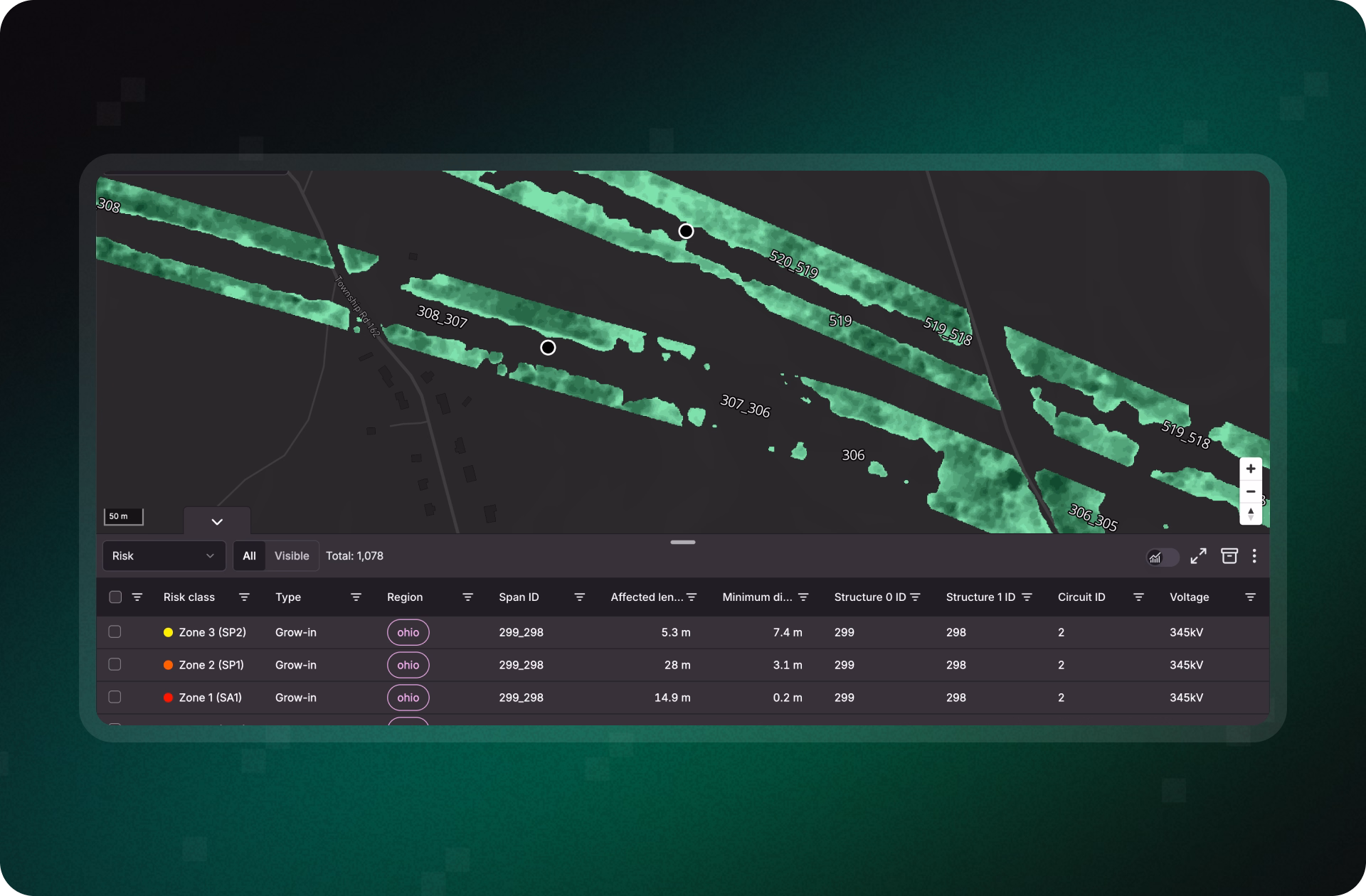 Each span is scored through a multi-factor model that considers vegetation type, growth rate, proximity, and grid criticality. Interactive dashboards and exportable work items give planners a clear hierarchy of risk, helping direct crews and budgets toward the spans most likely to cause outages.